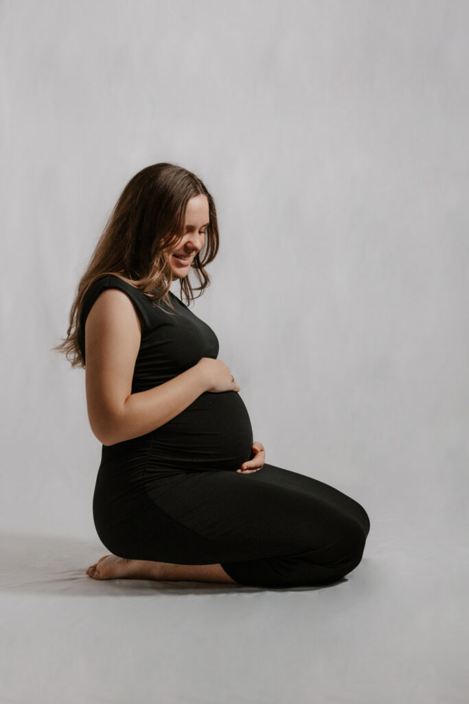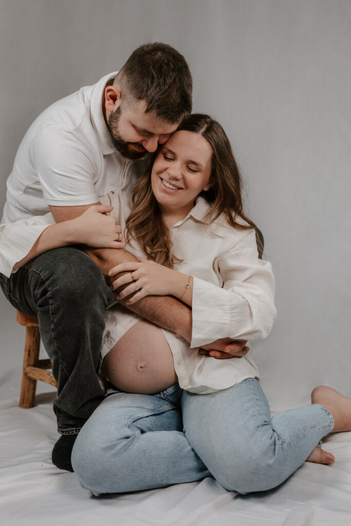 Fotostudio-Shooting: Eine ruhige Atmosphäre ohne Ablenkungen, in der ihr euch als Paar ganz fallen lassen könnt. Bei Kaffee, Tee und kleinen Snacks macht ihr es euch auf dem Sofa gemütlich, während wir eure innigen Augenblicke und das Wunder eures Babybauchs festhalten.